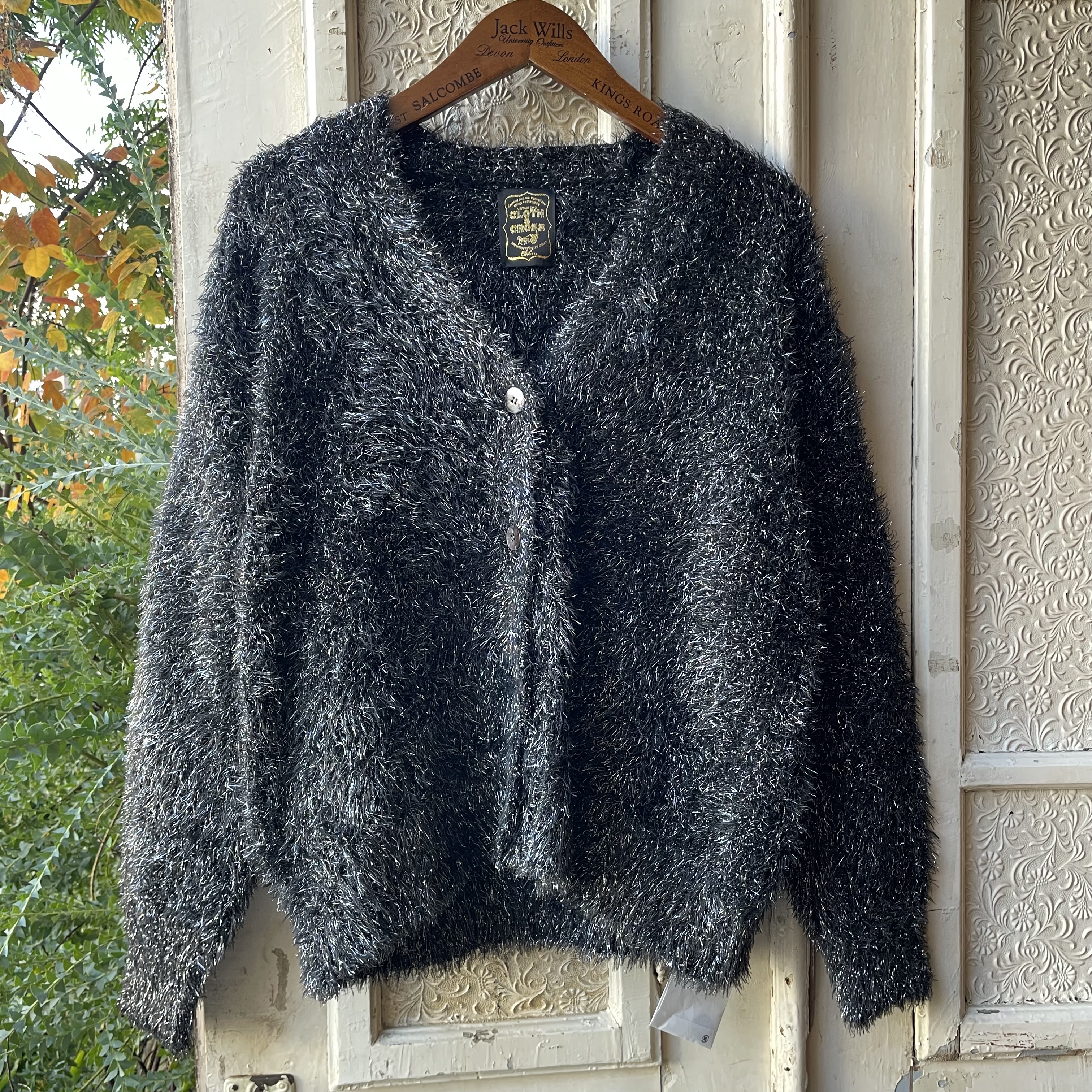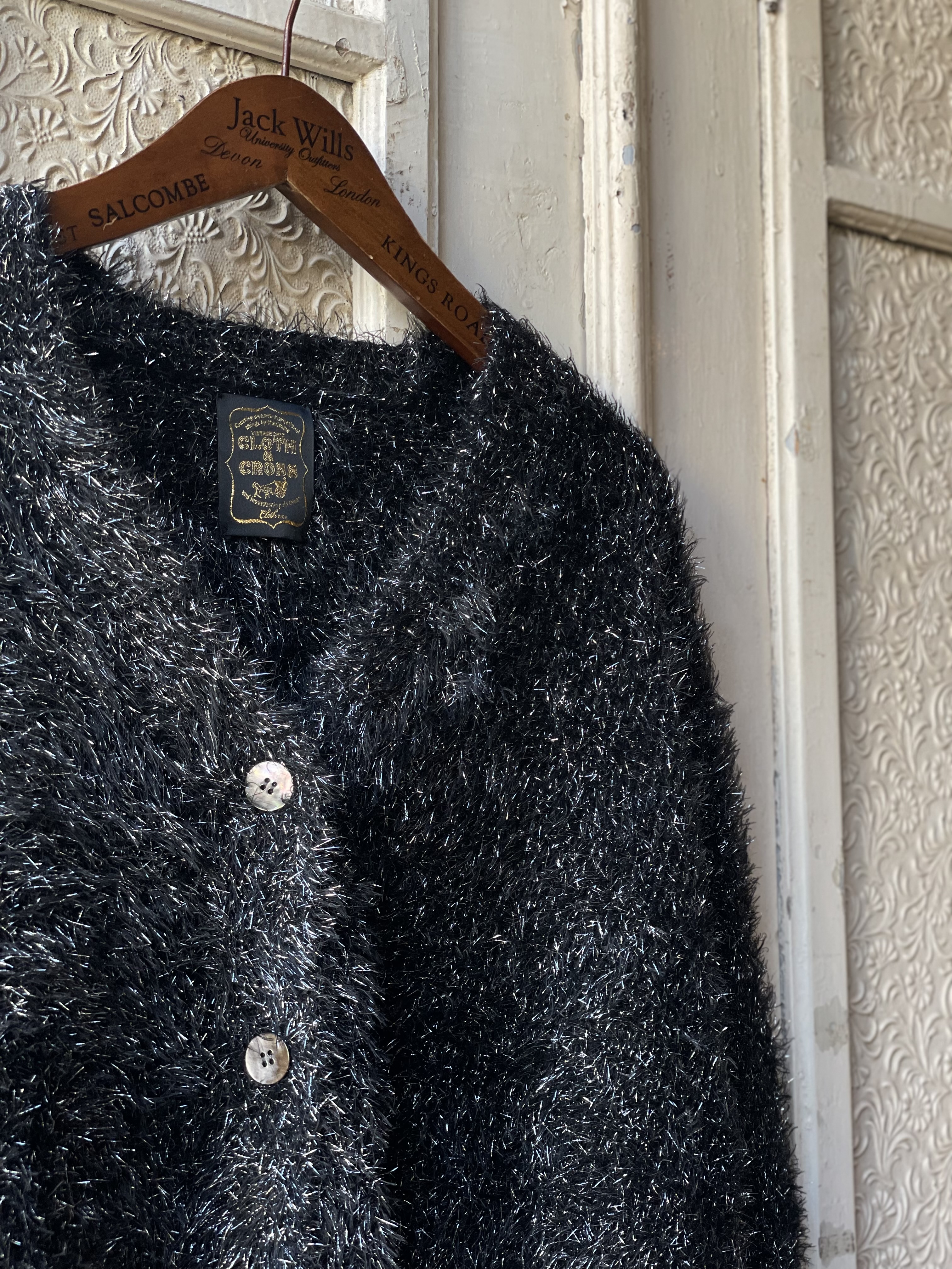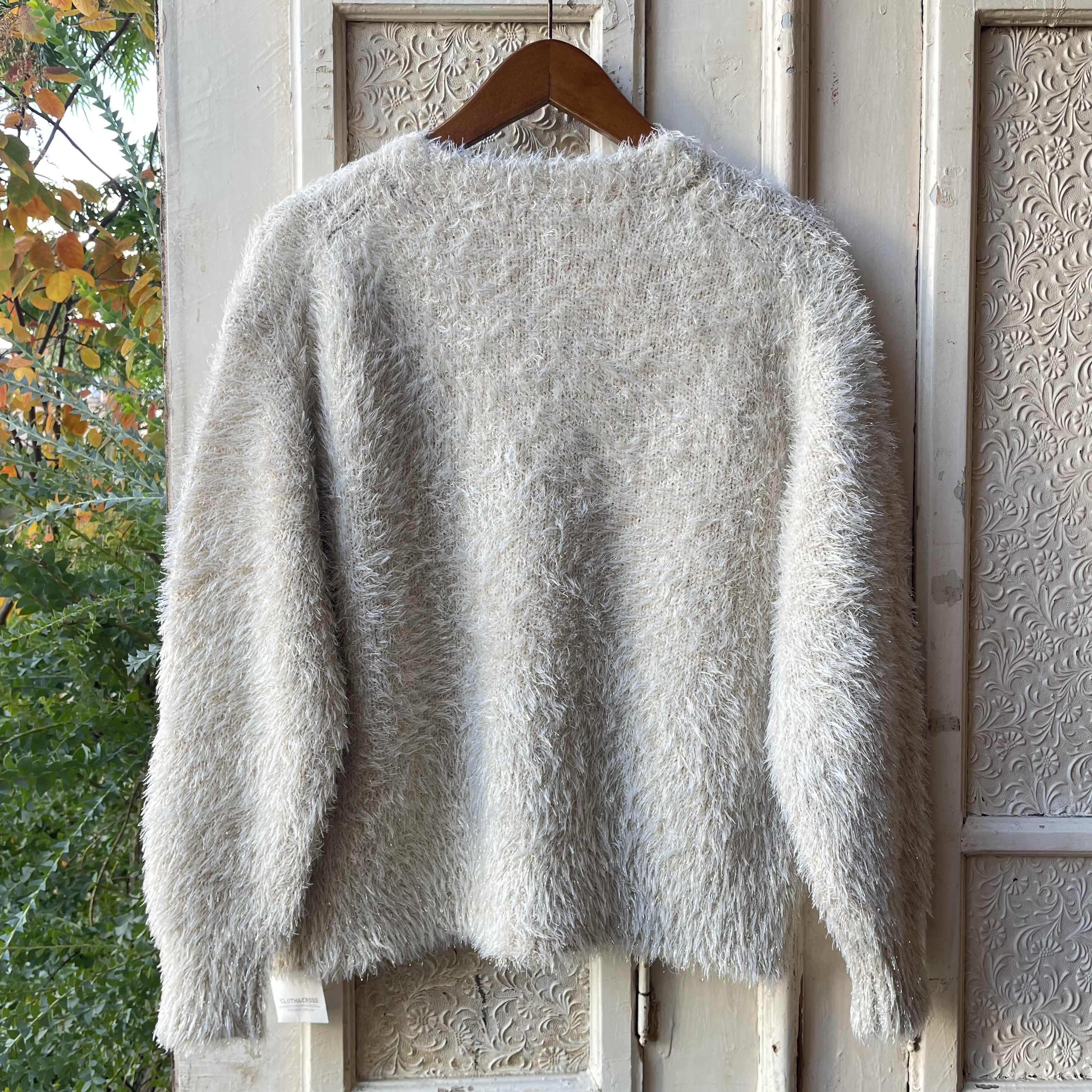 ふんわりと柔らかなシャギー素材に、ほのかなラメのきらめきをまとわせた、シーズンムードたっぷりのVネックカーディガン。