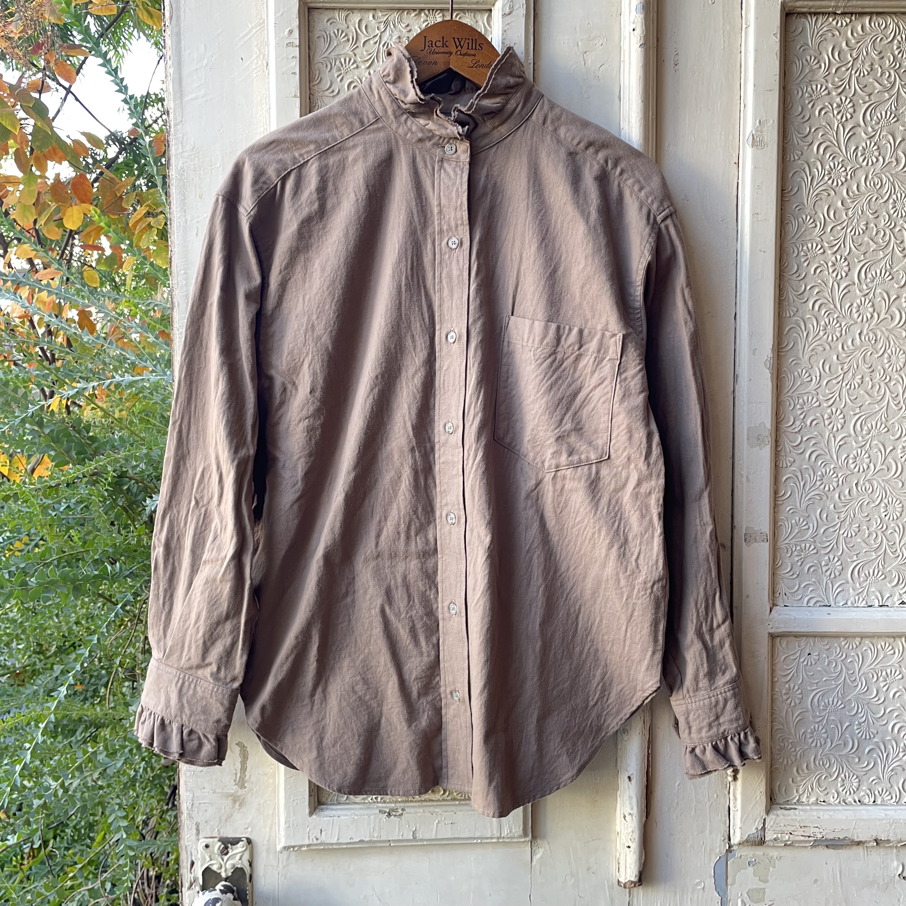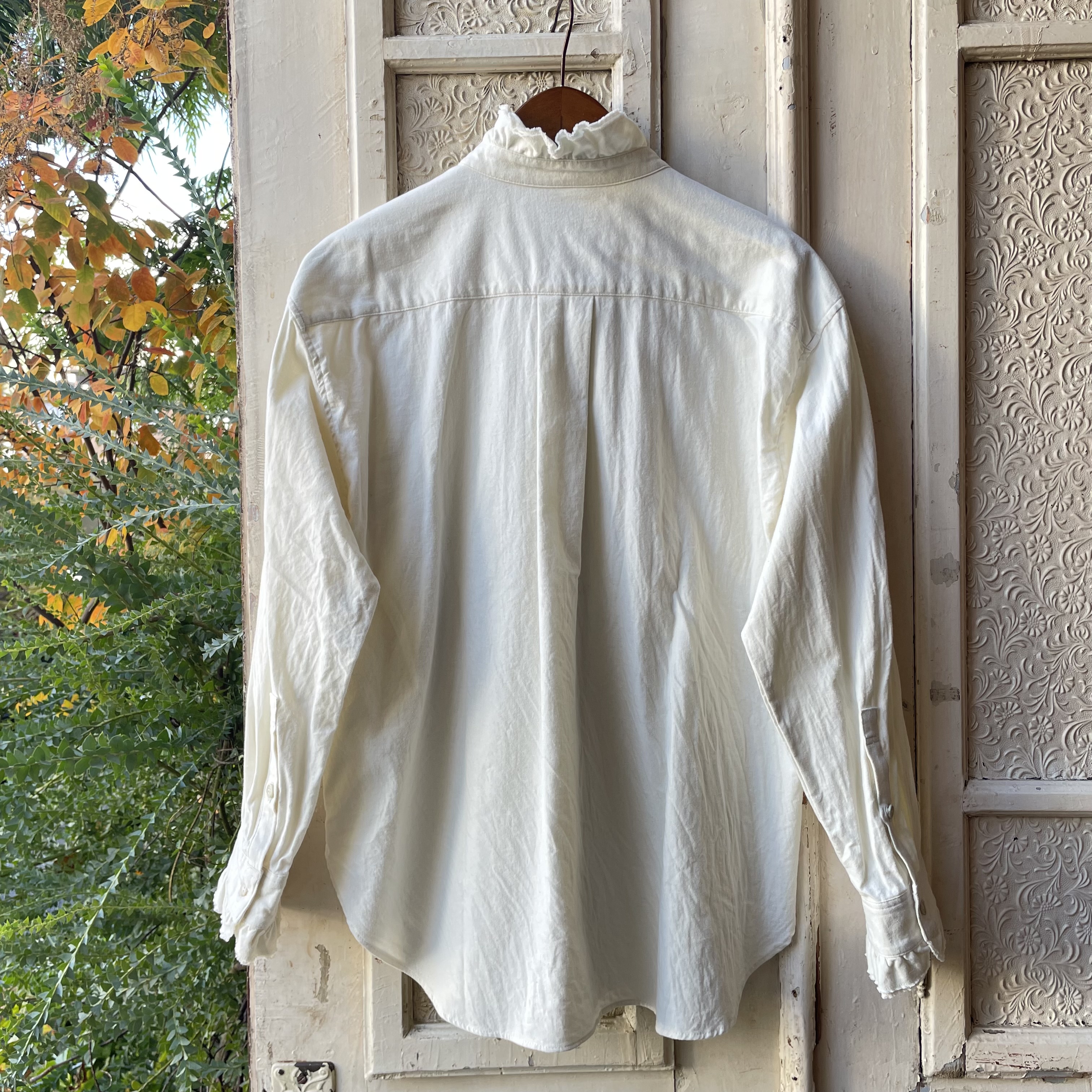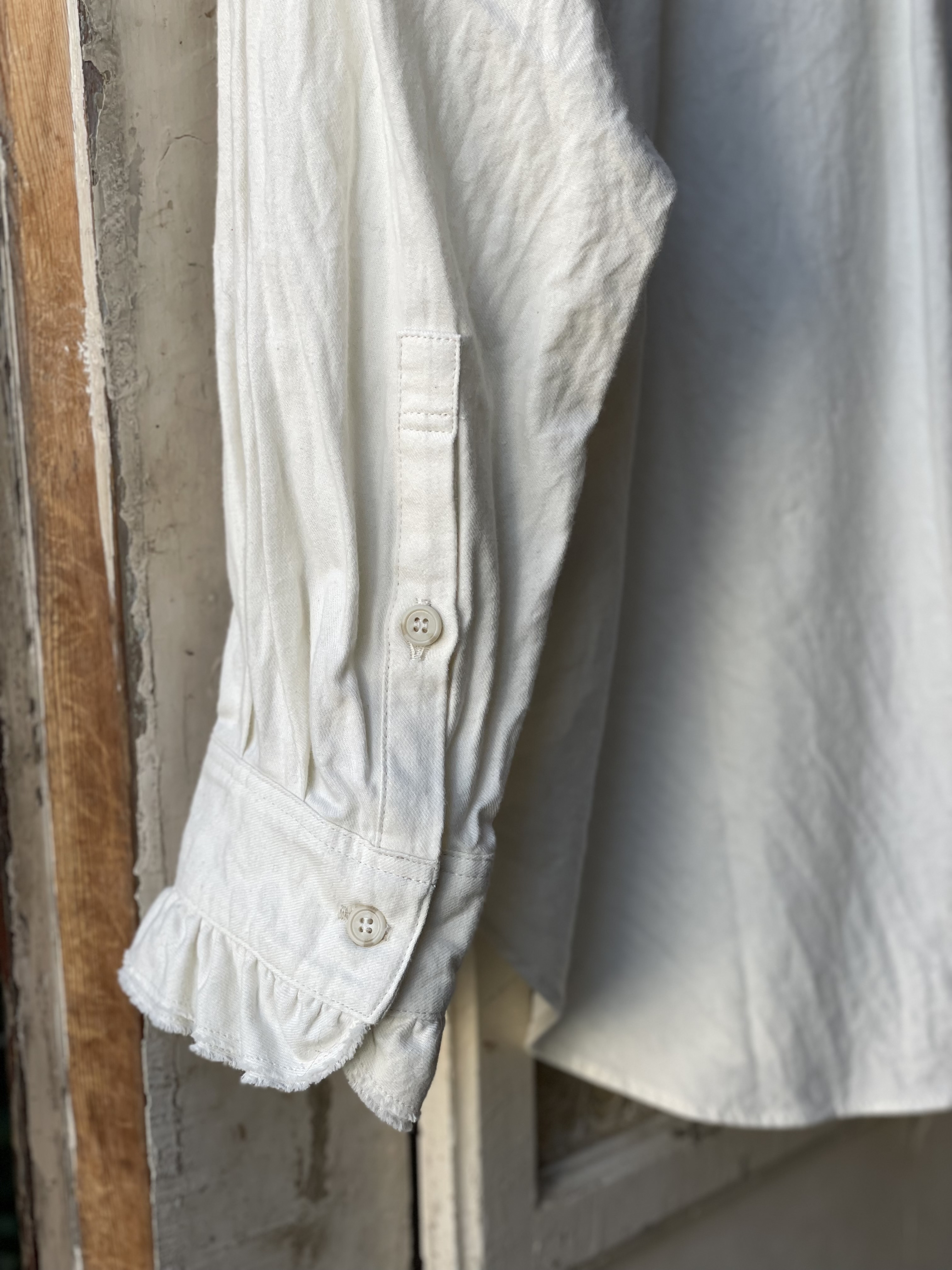 シンプルな佇まいの中にも、襟やカフスにあしらった、繊細な2枚仕立てのカットオフフリルが表情に奥行をプラスしてくれます。