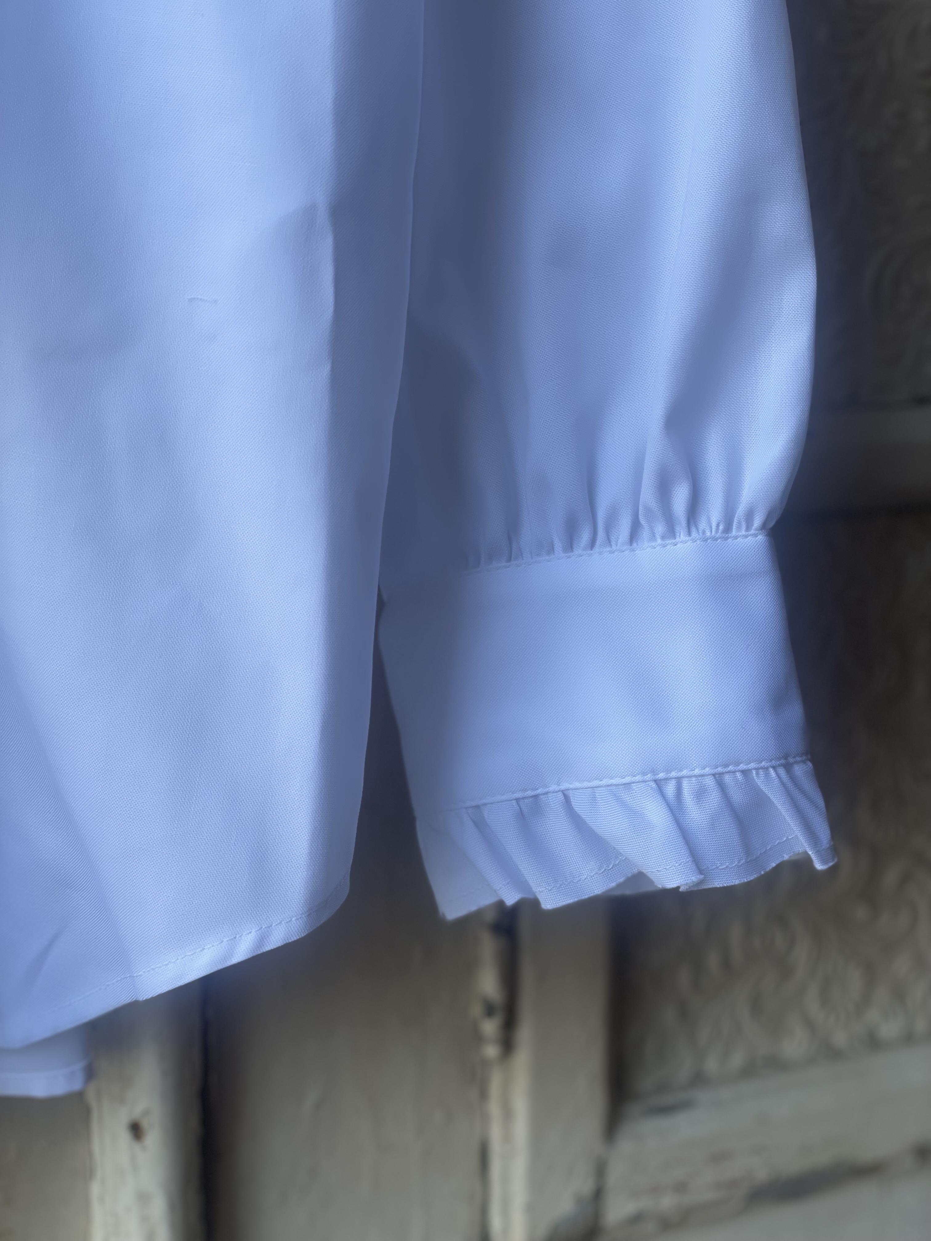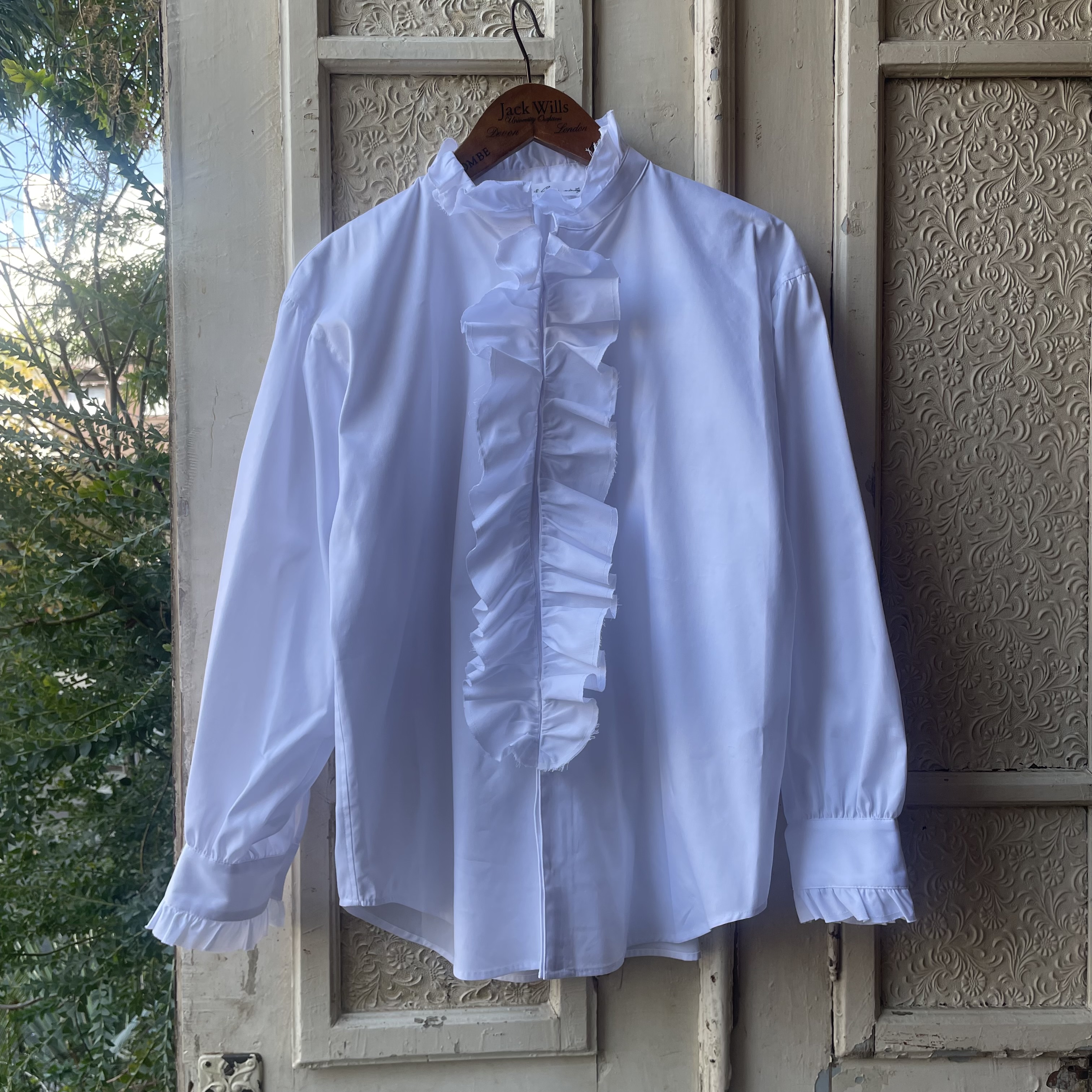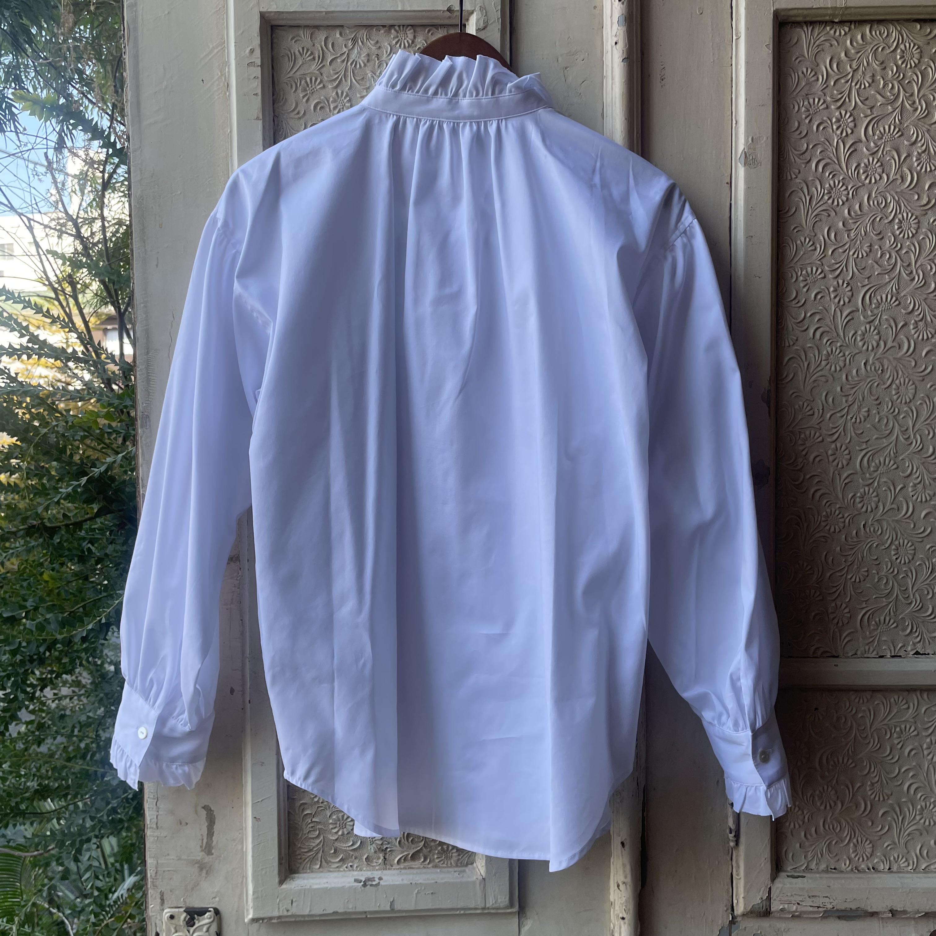 スペイン・バルセロナの老舗シャツ生地メーカー「SIDOGRAS(シドグラス)」のしなやかな生地で仕立てた、無地タイプのラッフルフリルシャツ。