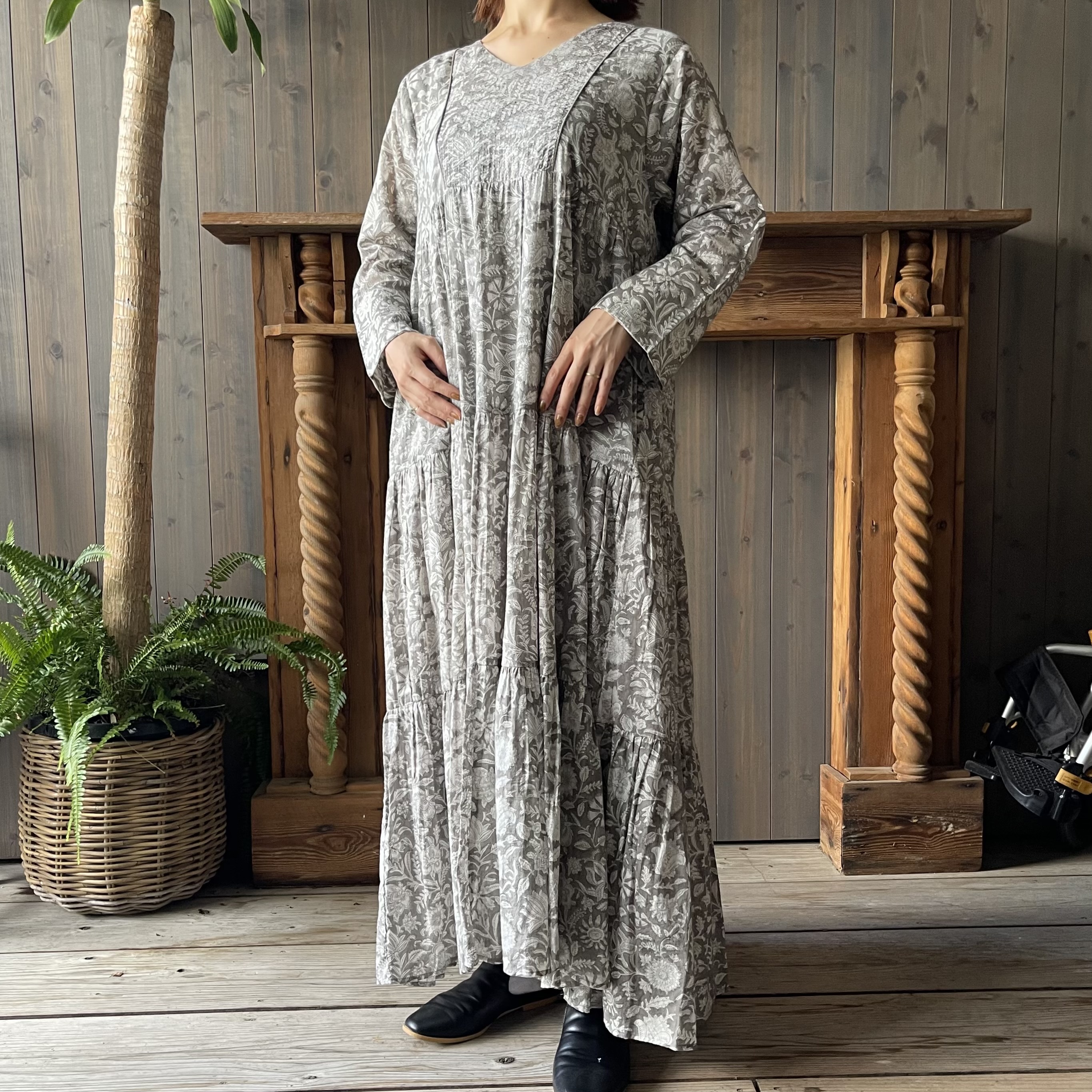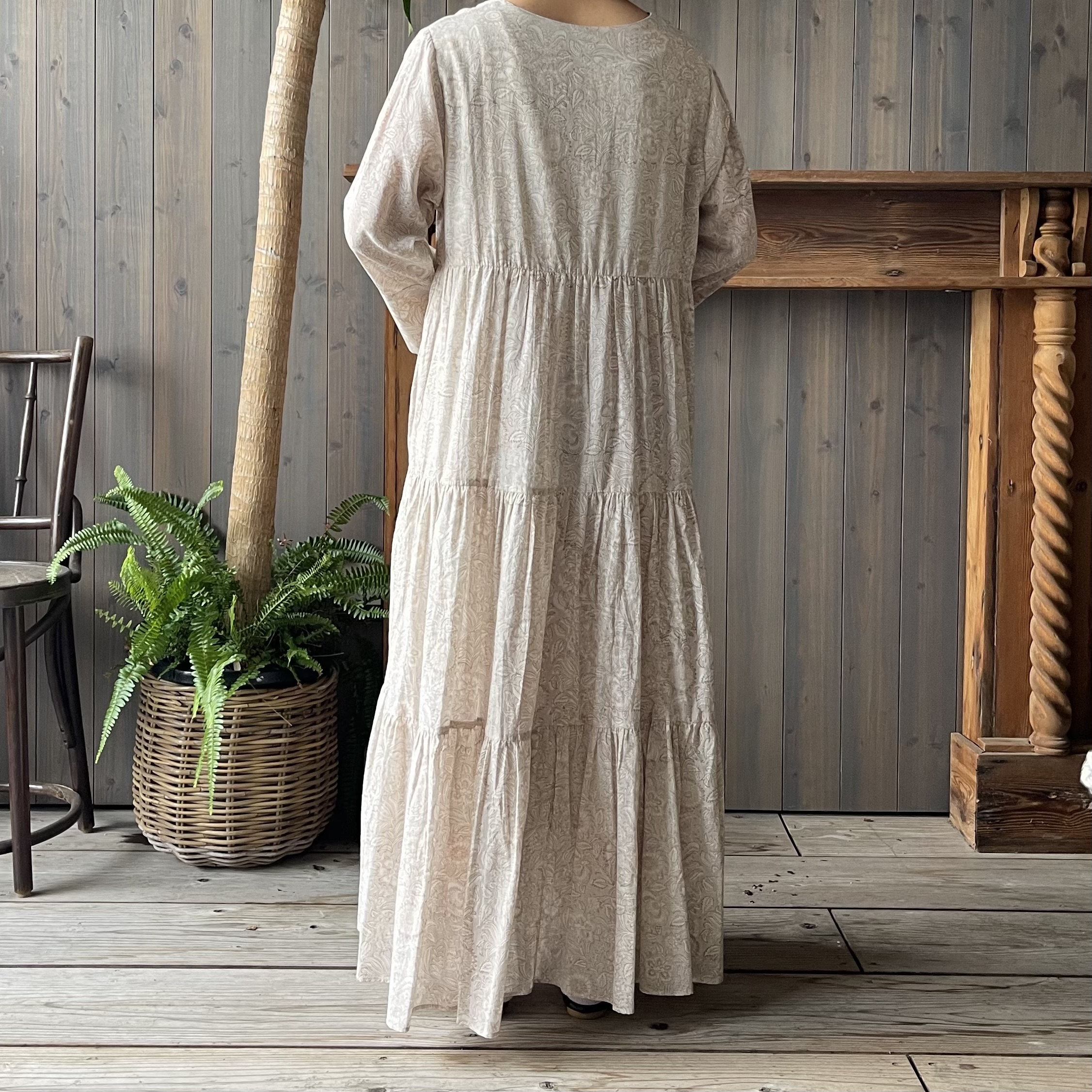 インドならではの柔らかなコットンボイル生地に、カラムカリ風のブロックプリントを施したティアードドレス。