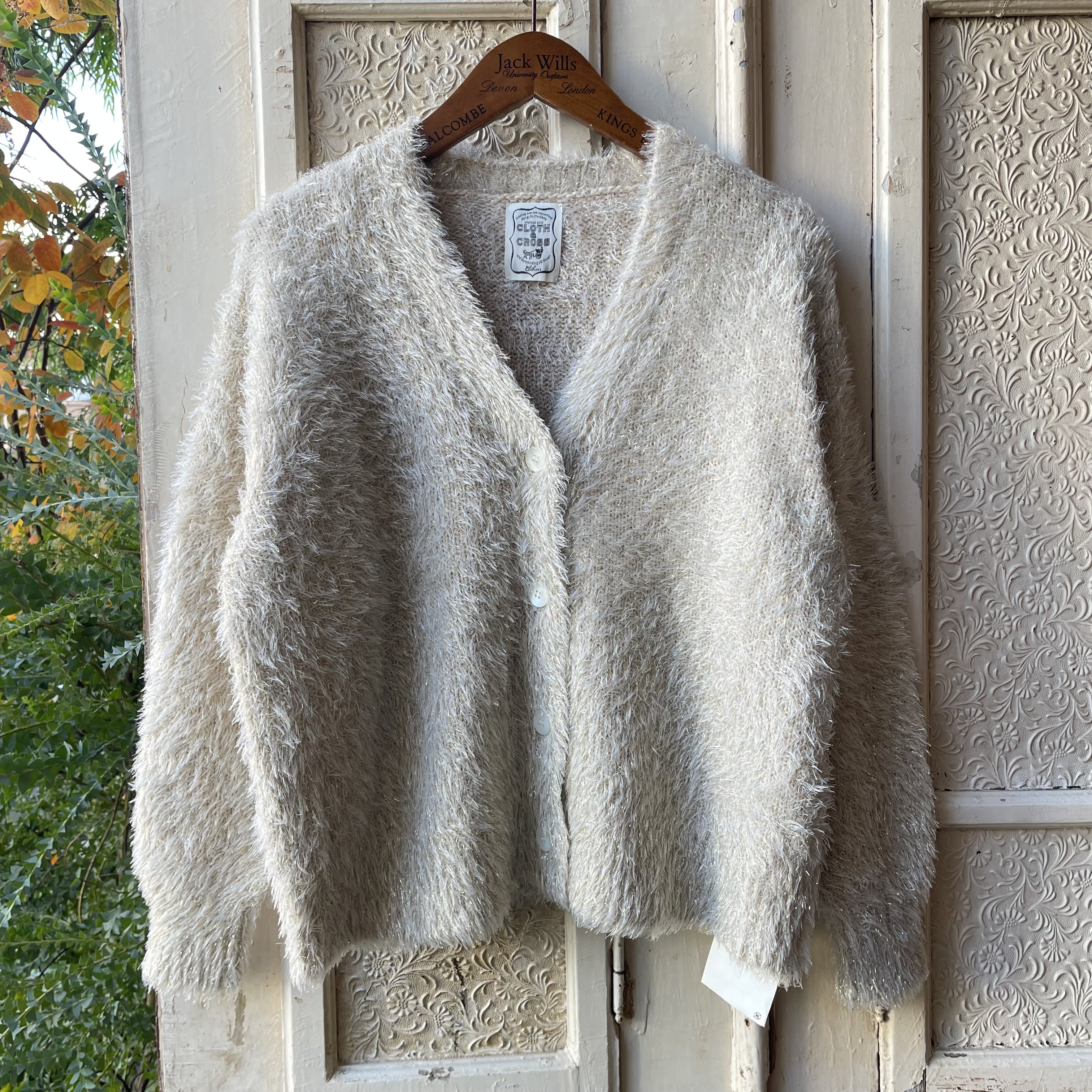 ふんわりと柔らかなシャギー素材に、ほのかなラメのきらめきをまとわせた、シーズンムードたっぷりのVネックカーディガン。