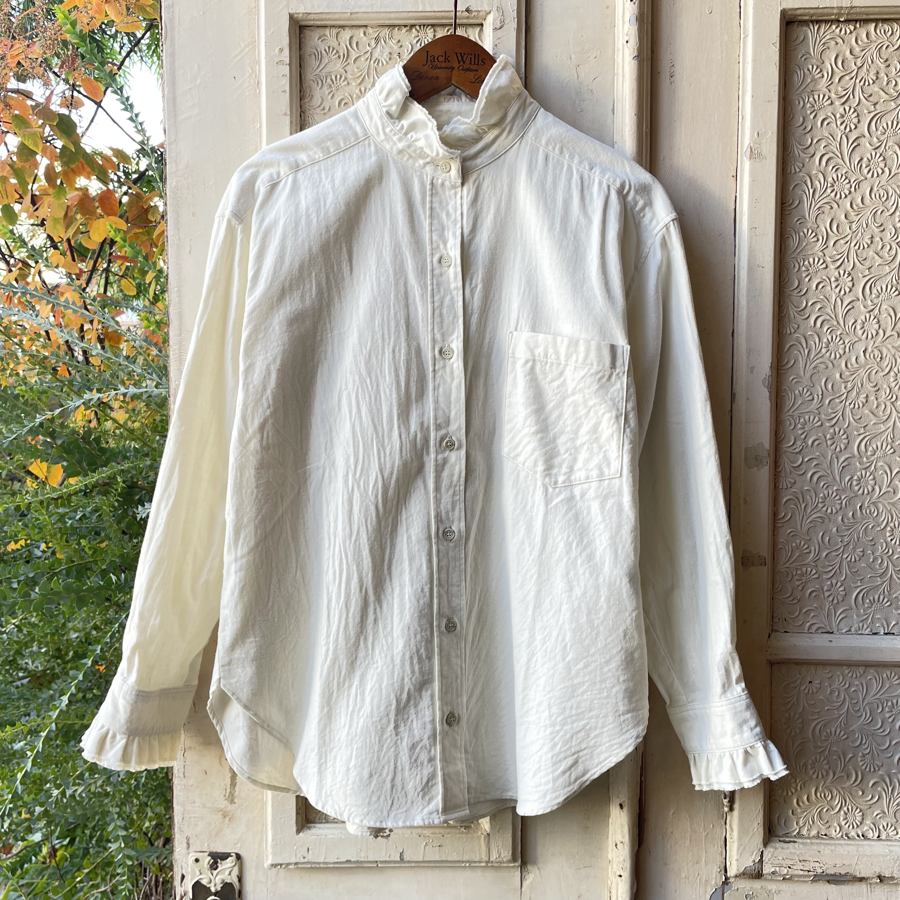 シンプルな佇まいの中にも、襟やカフスにあしらった、繊細な2枚仕立てのカットオフフリルが表情に奥行をプラスしてくれます。